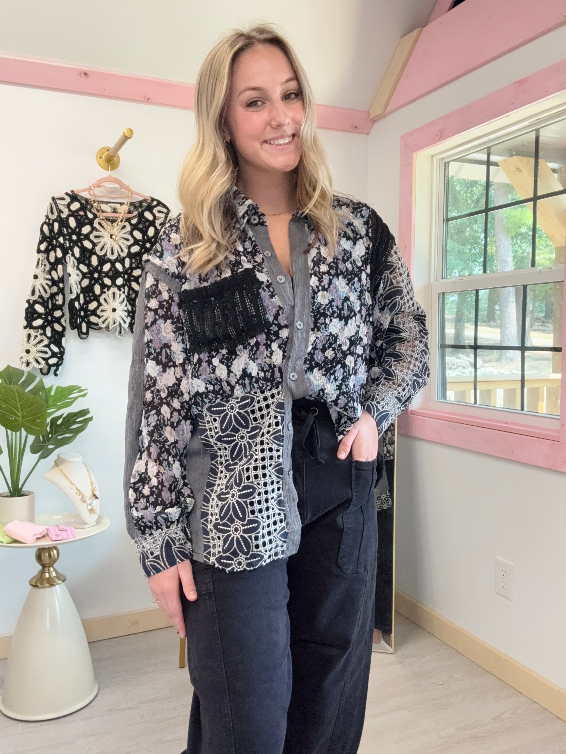 Introducing our stunning mixed-media blouse, a perfect blend of floral and lace patterns! This unique piece features a charming floral print on one side and intricate lace detailing on the other, creating a delightful contrast. The lightweight fabric ensures comfort, while the button-up design adds a touch of sophistication. Pair it with your favorite high-waisted pants for a chic look that’s perfect for any occasion. Elevate your wardrobe with this eye-catching top!