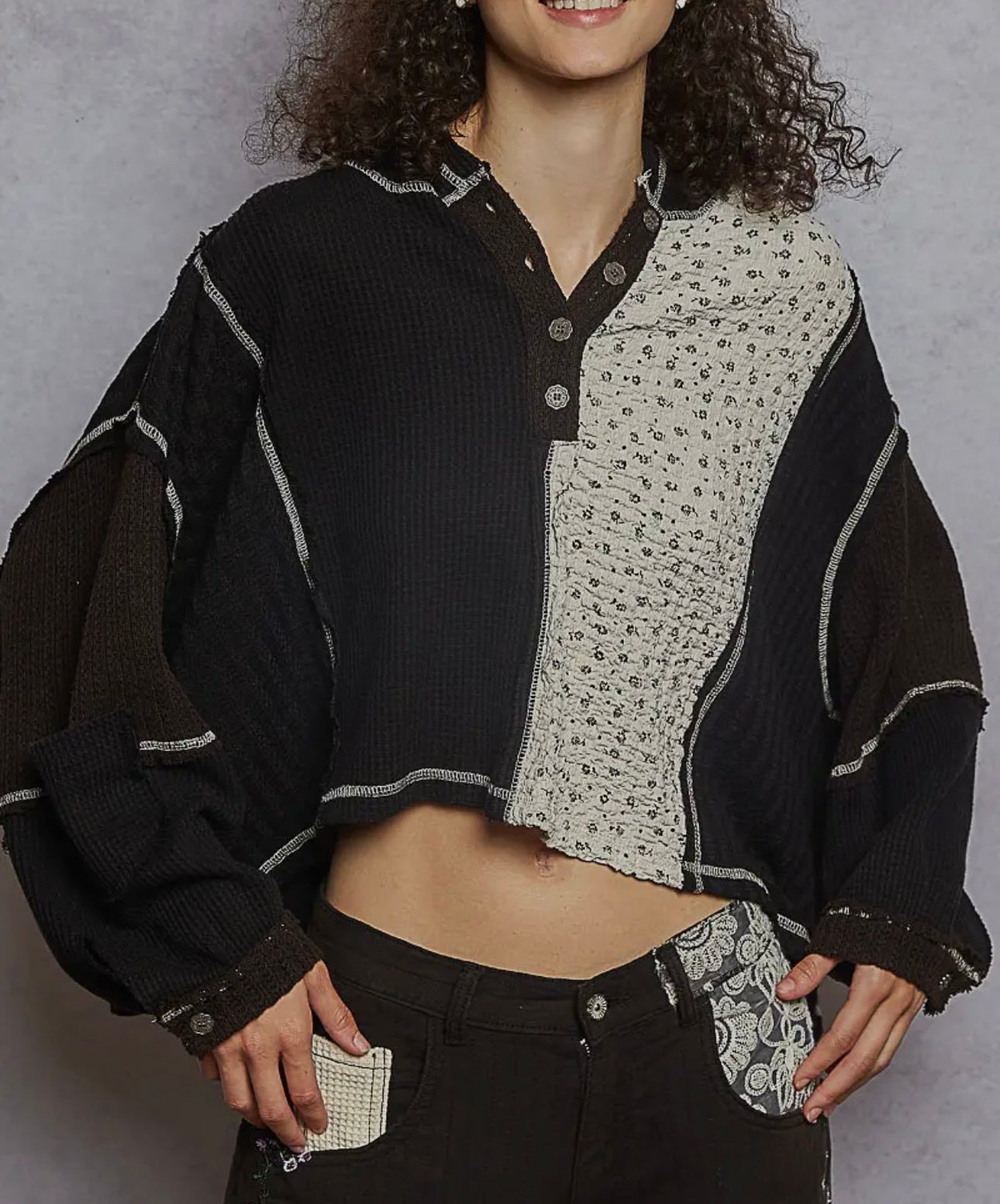 Designed in placket hoodie, balloon sleeve, semi cropped fit top in thermal and cut and sew knit mix with overlock stitch detail pointed floral pattern.