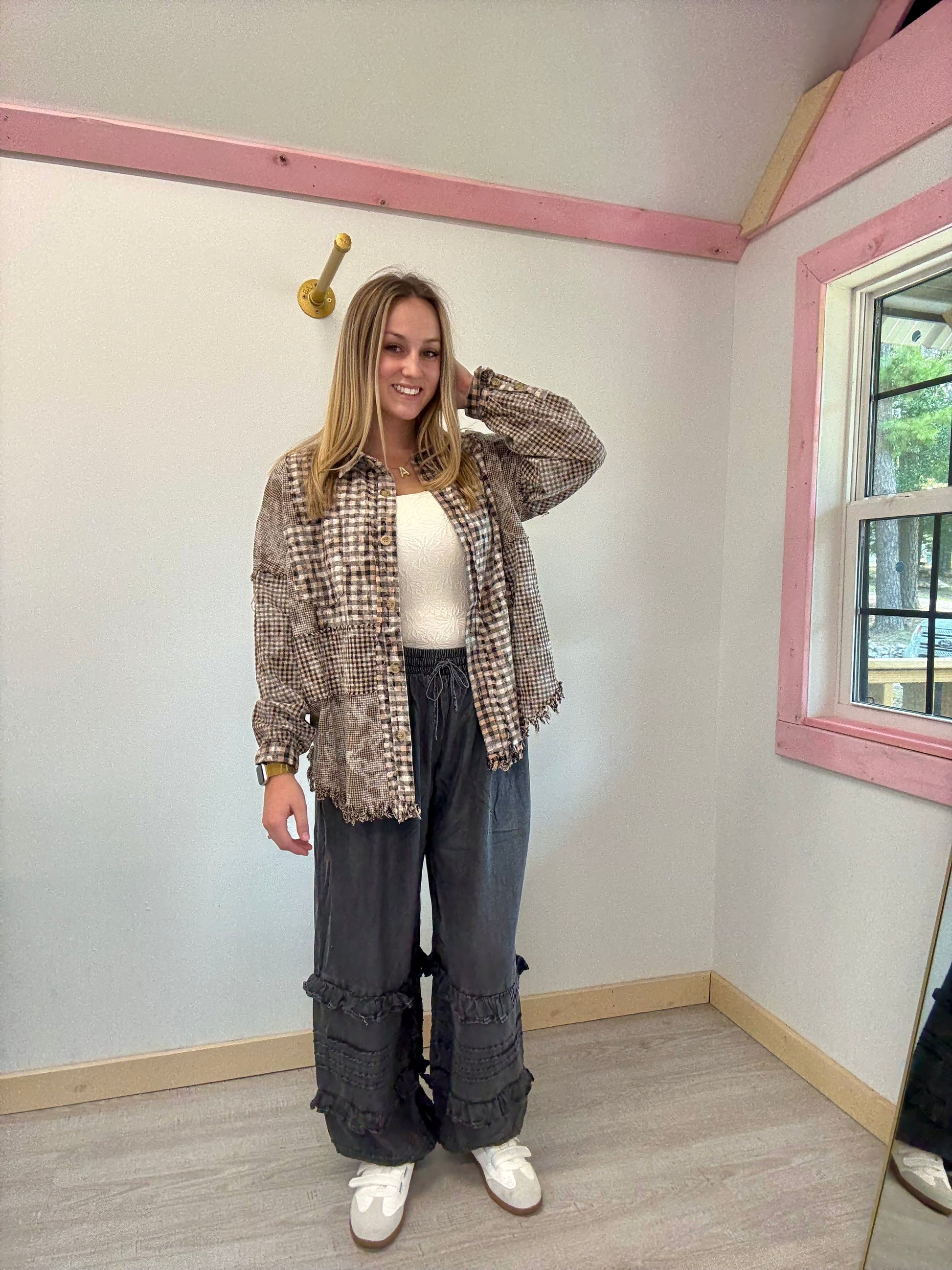 "Stay stylish and comfortable in our playful Black Tencel Tiered Ruffle Joggers. Made with 100% Tencel fabric, these joggers feature a unique tiered ruffle design for a touch of flair. Available in sizes small, medium, large, and X-Large, these joggers are perfect for adding a fun twist to your wardrobe. (Get ready to jog in style!)"