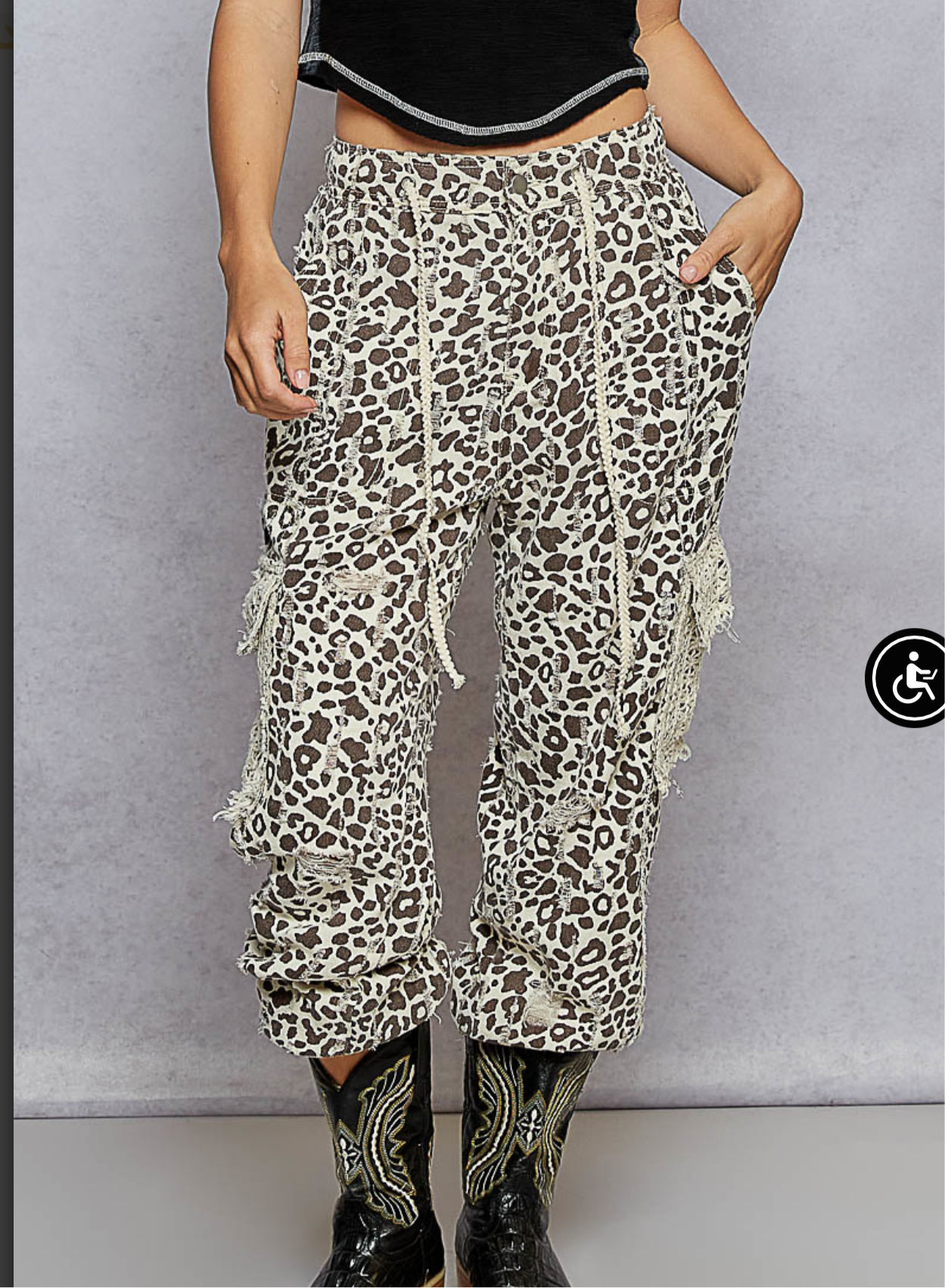 Designed in jogger denim pants with trim loop in waistband, side crochet lace pocket, and distress detailing.