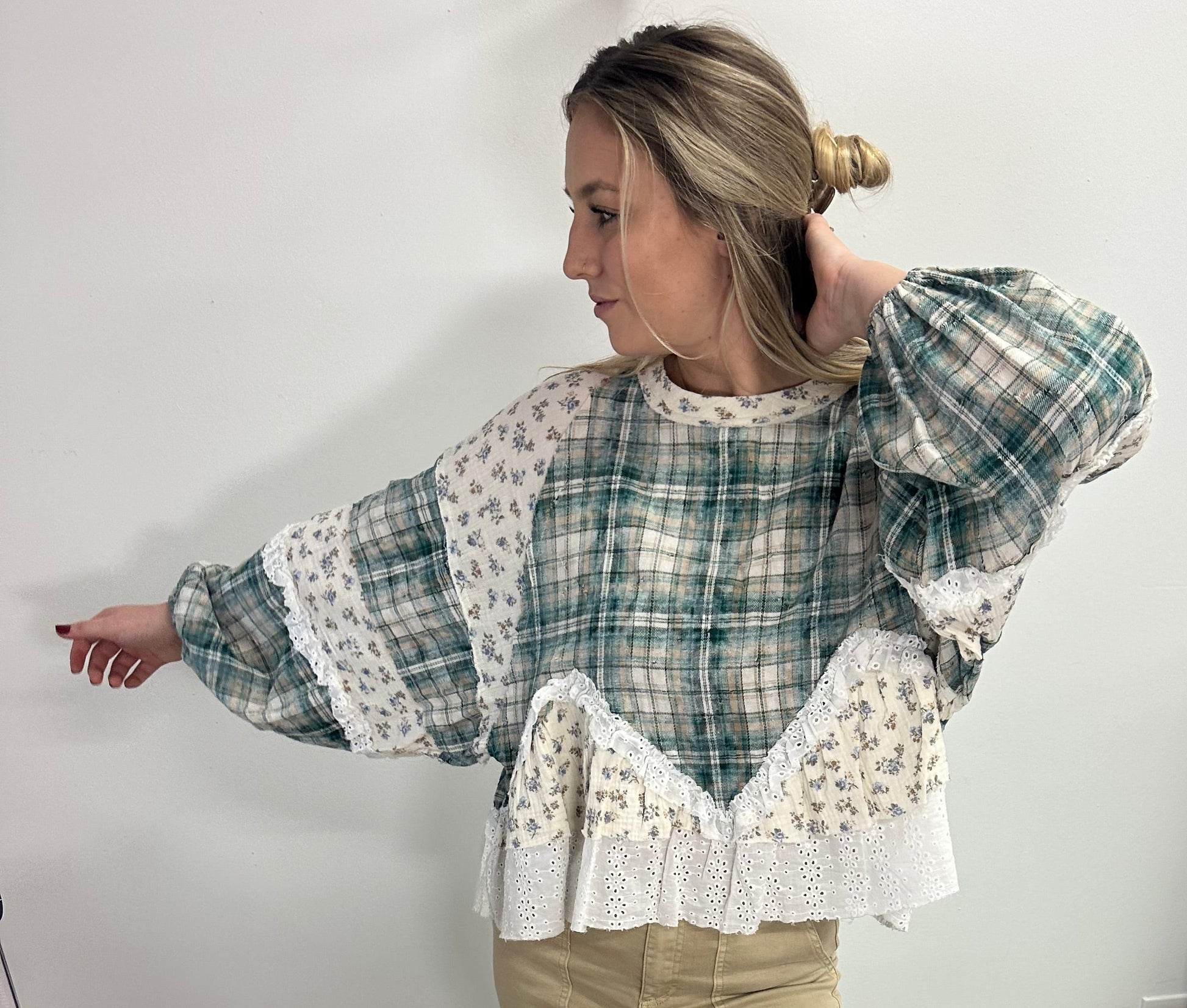 Designed in round neck balloon sleeve relaxed fit top in print (plaid) with ruffle, outseam, raw edge, vintage washing, floral or plaid pattern.