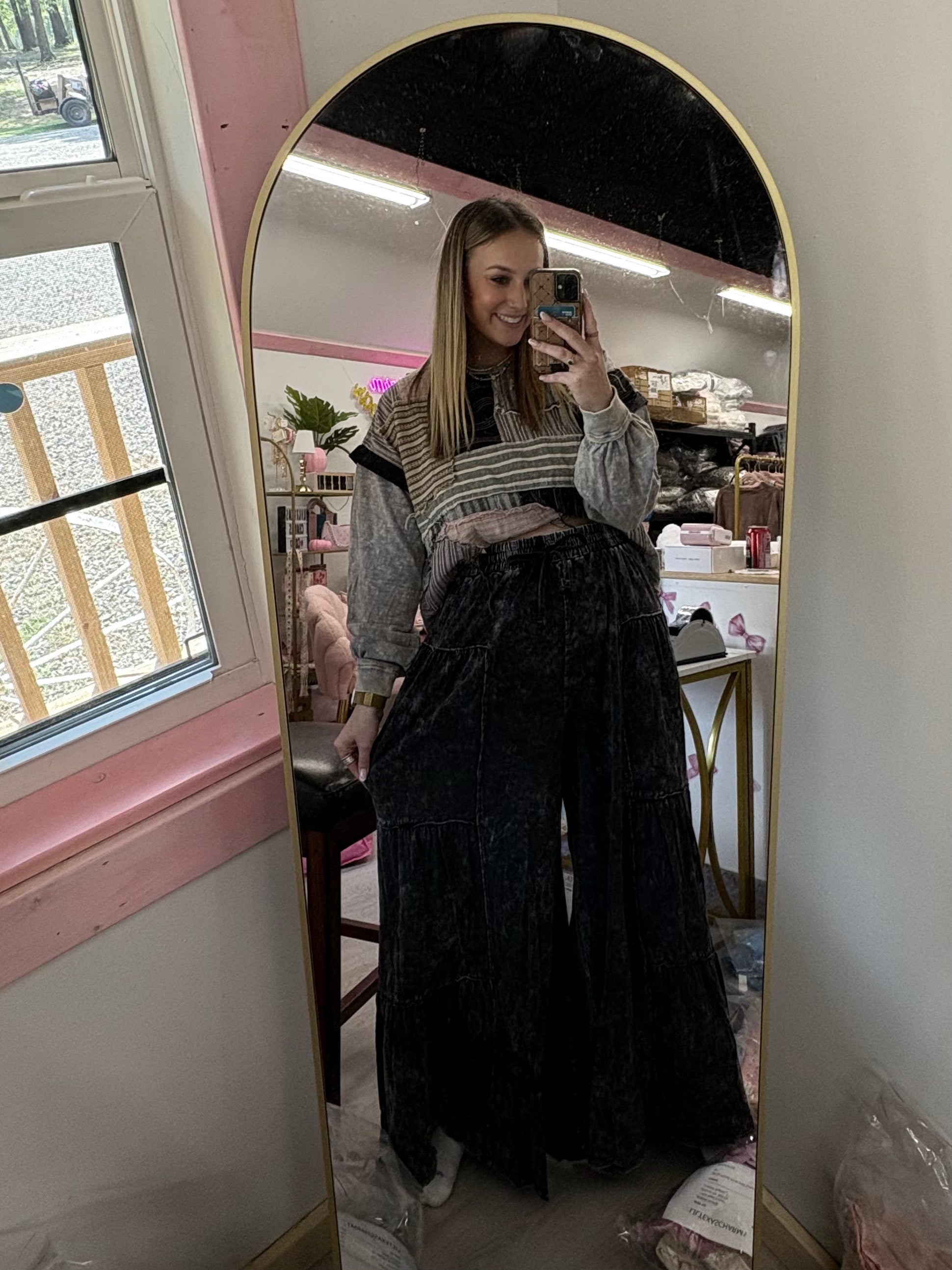 "Expertly crafted Howard Mineral Washed Black Oli and Hali Pants feature a unique mineral wash that adds a touch of texture and depth. These tiered wide leg pants are perfect for making a stylish statement while providing comfort and ease of movement. Perfect for any occasion, these pants are a must-have addition to any wardrobe."