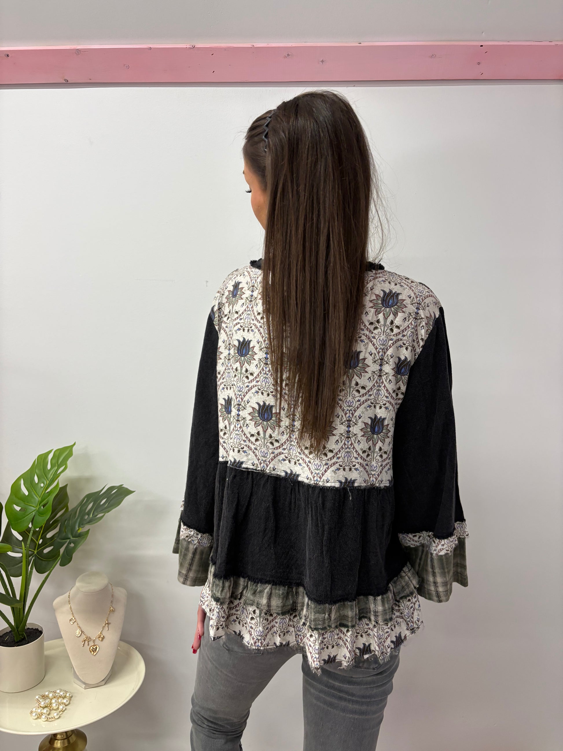 Designed in round neck long sleeve relaxed fit top in textured woven with ruffle detail.