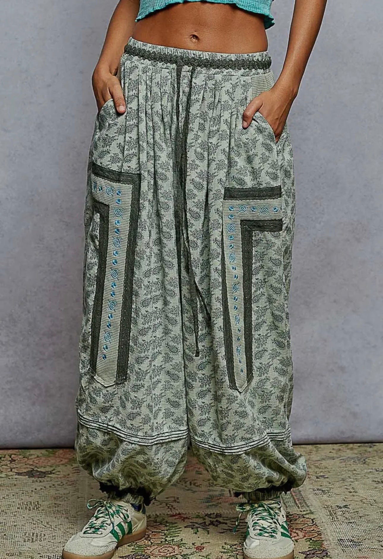 Designed in pants, relaxed fit in double gauze with embroidery detail pointed paisley pattern.
