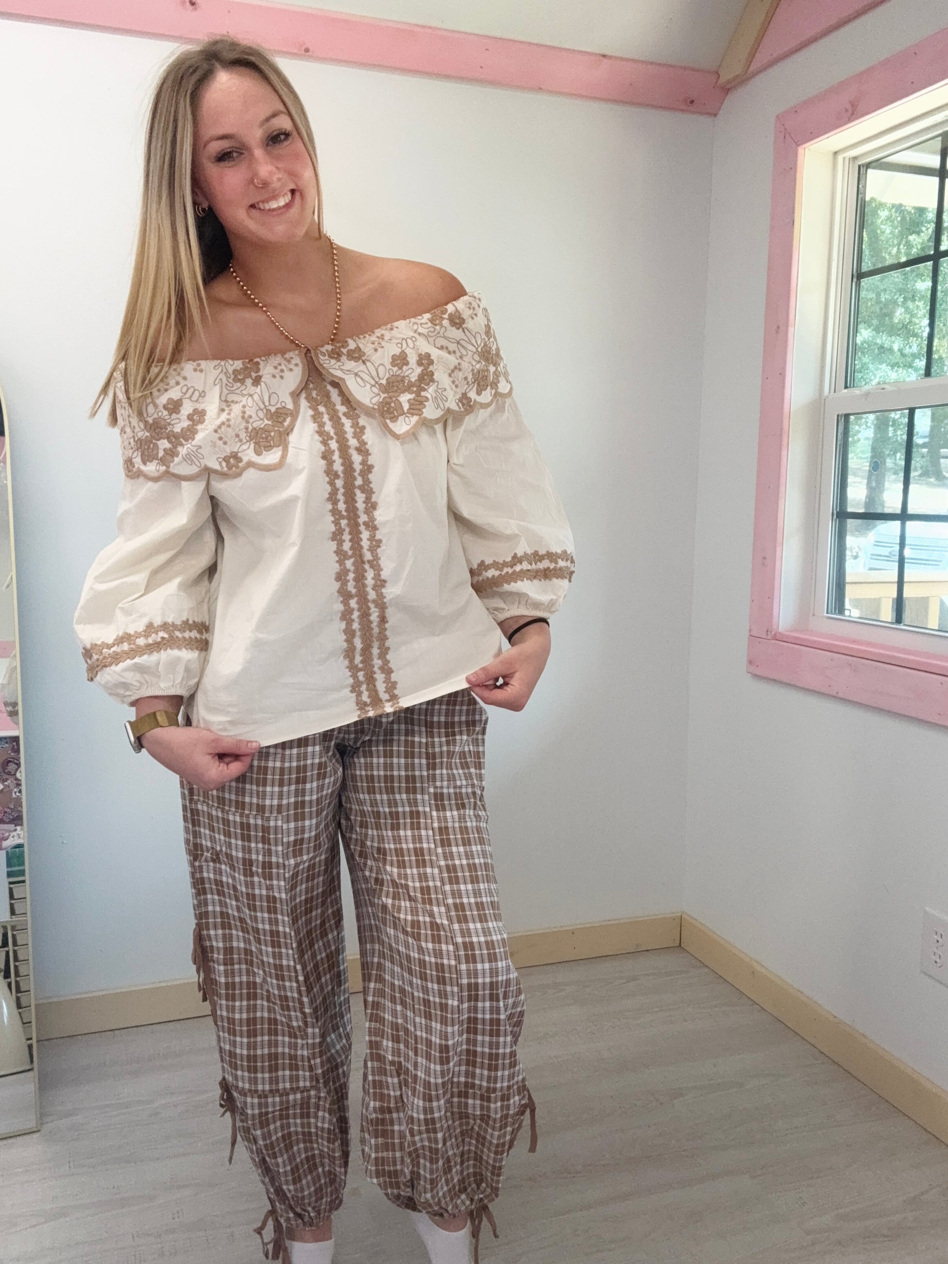 Tan Large Collar Embroidered Top Easel