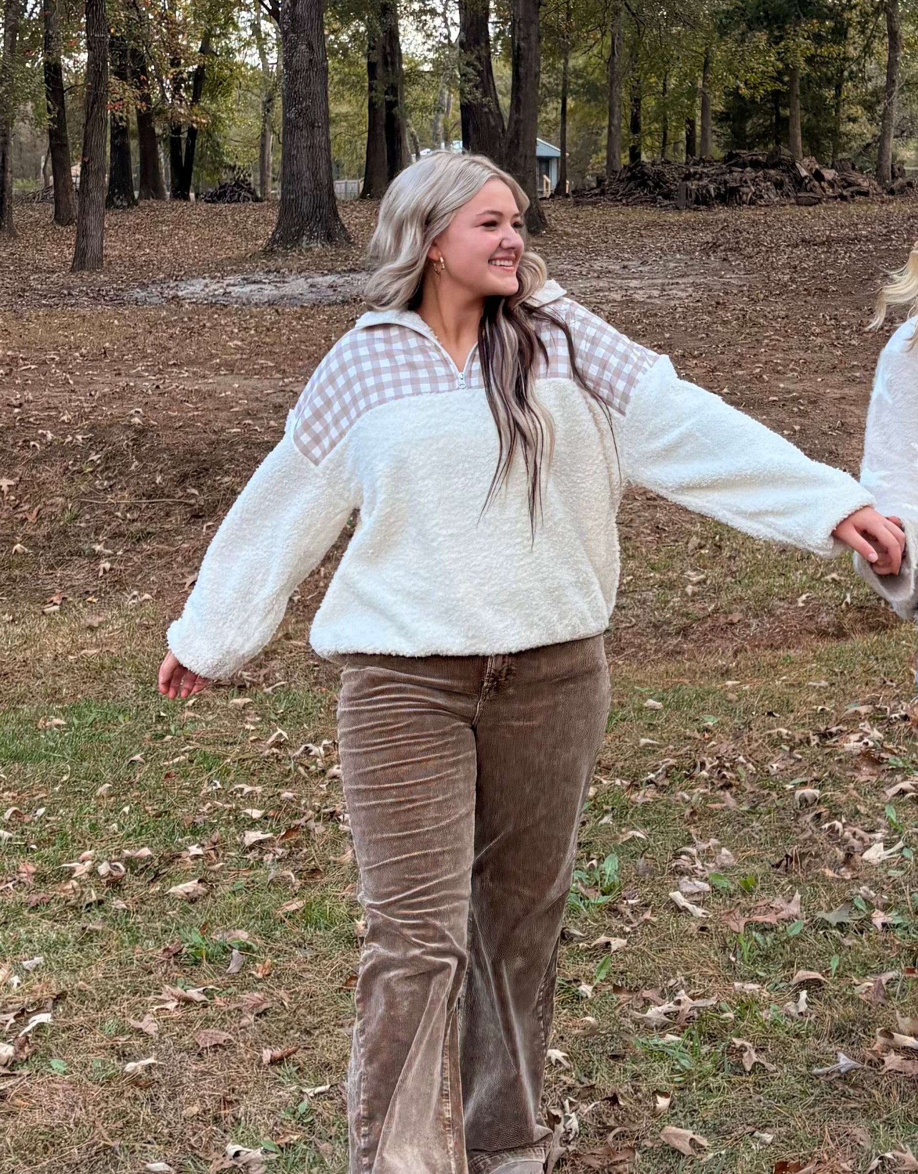 Taupe Gingham Plaid Fleece Jacket Happy Camper