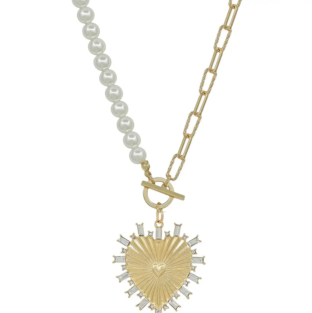 this Pearl and Gold Chain Necklace features a Rhinestone Studded Heart Charm that exudes elegance and charm. Adjustable between 16" to 18", it can be tailored to suit your style preference. Perfect for those seeking a blend of pearls, golden allure, and a touch of sparkle. Ideal for enhancing your look or adding a finishing touch to your evening ensemble. Get ready to turn heads with this beautiful piece!